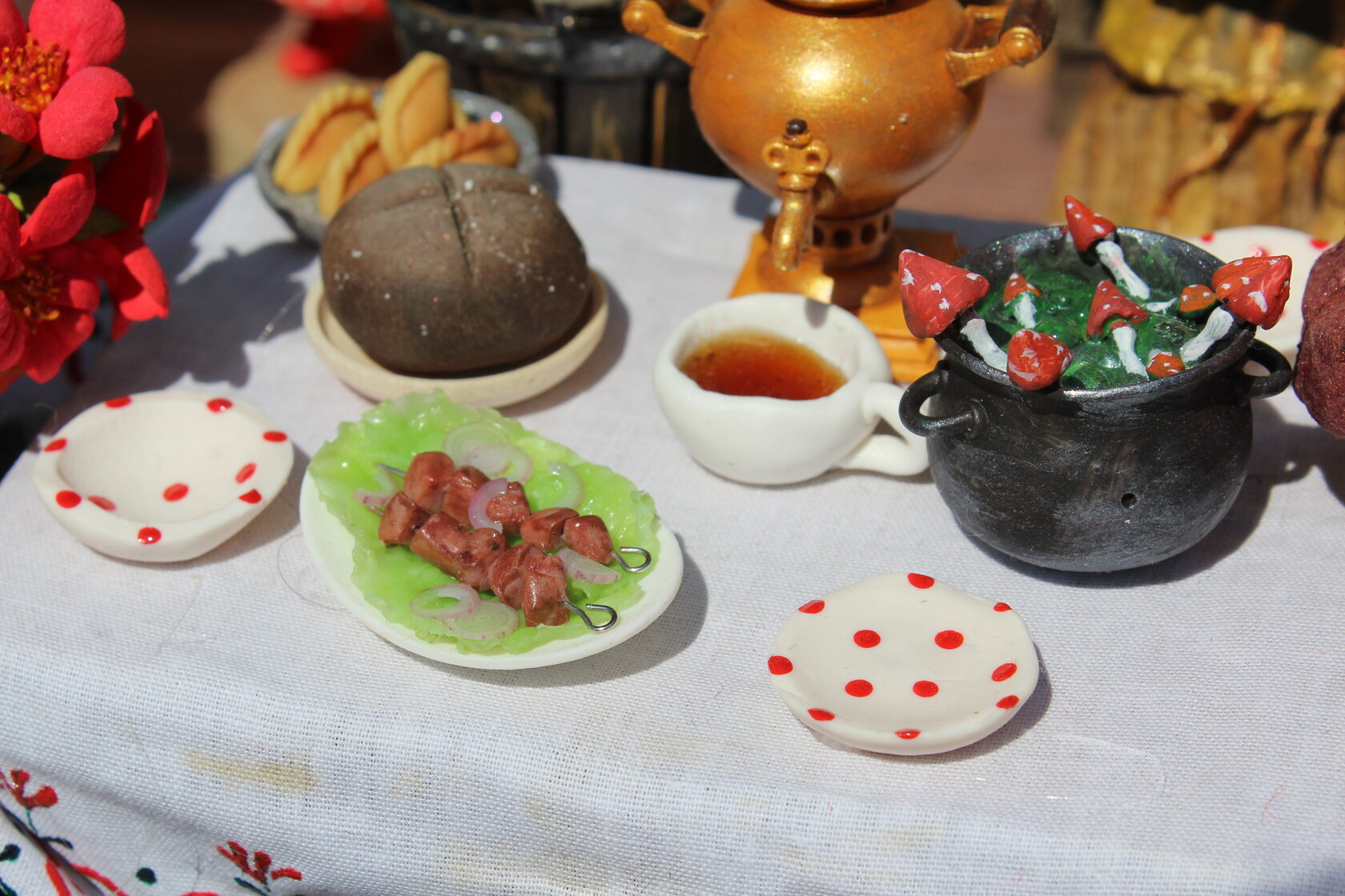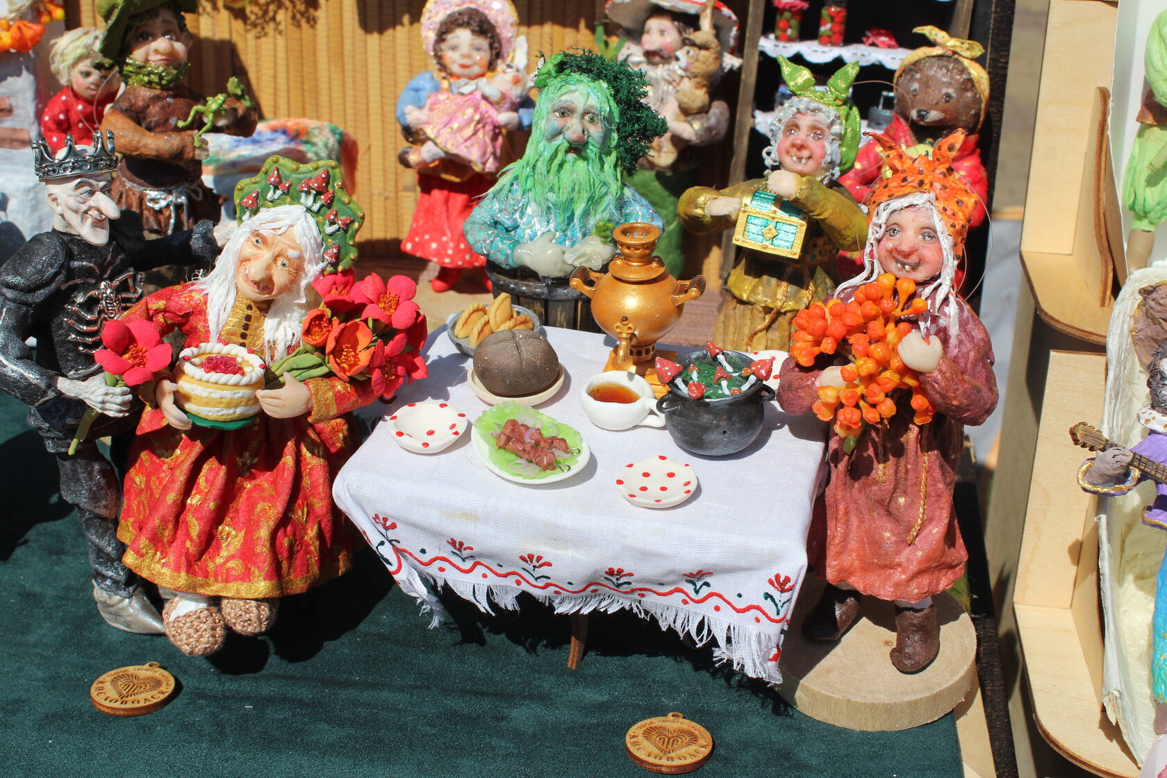 Один из них, созданный местной мастерицей Юлией Бойковой, посвящён 255 - летию Бабы Яги. В этой композиции ватные игрушки сказочных персонажей — Водяного, Кощея Бессмертного, домовёнка Кузи и других волшебных существ — собрались, чтобы отметить день рождения. Герои запечатлены в момент приготовления праздничного угощения — супа из мухоморов. Невероятная детализация этих изделий завораживает.