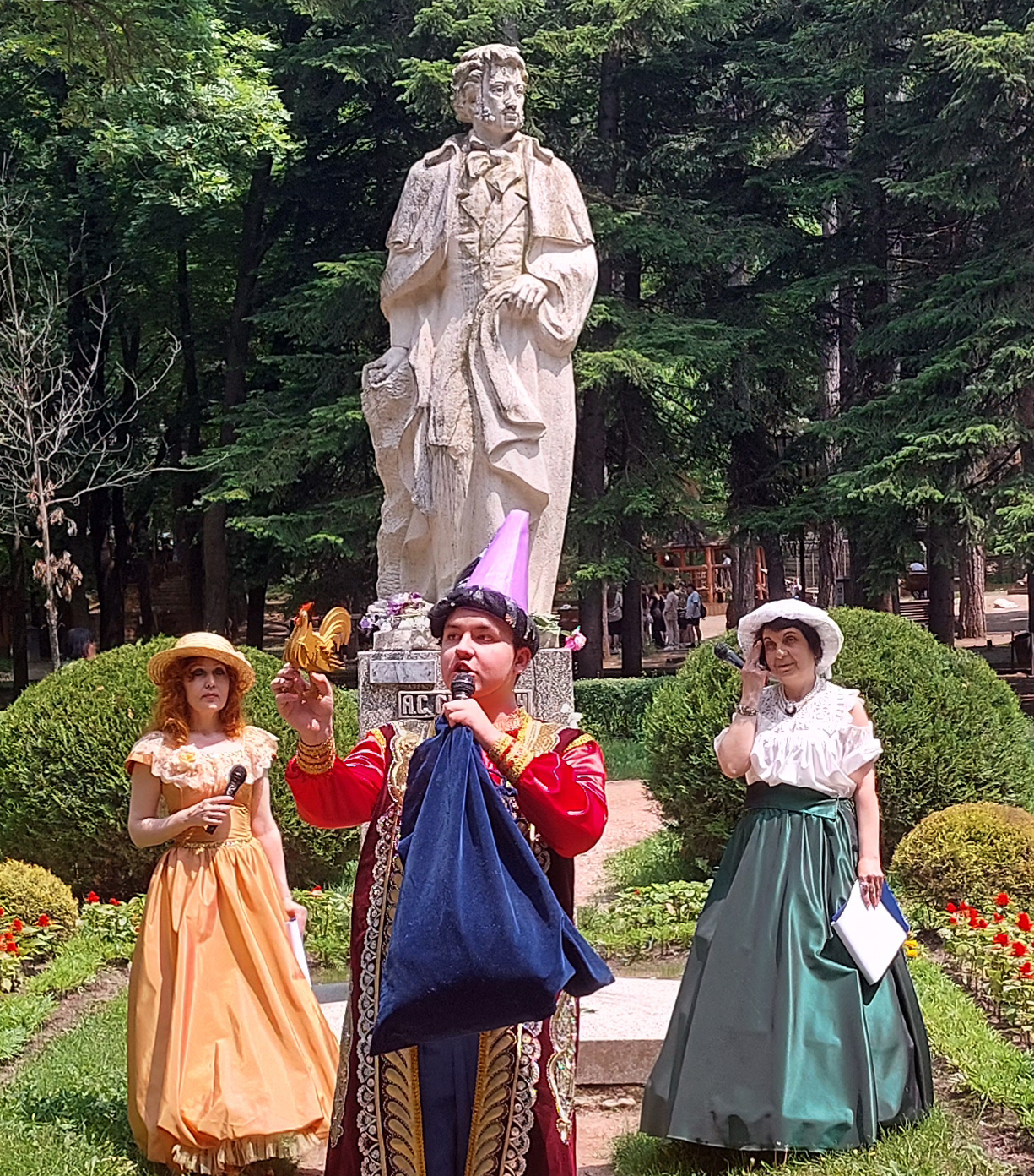 Обо всём этом и многом другом из жизни Пушкина собравшимся на праздник ребятам из летних пришкольных лагерей, кисловодчанам и отдыхающим в нашем городе жителям других регионов России эмоционально рассказали облачённые в платья XIX века библиотекари Рузанна Саркисян и Ирина Вдовыдченко.