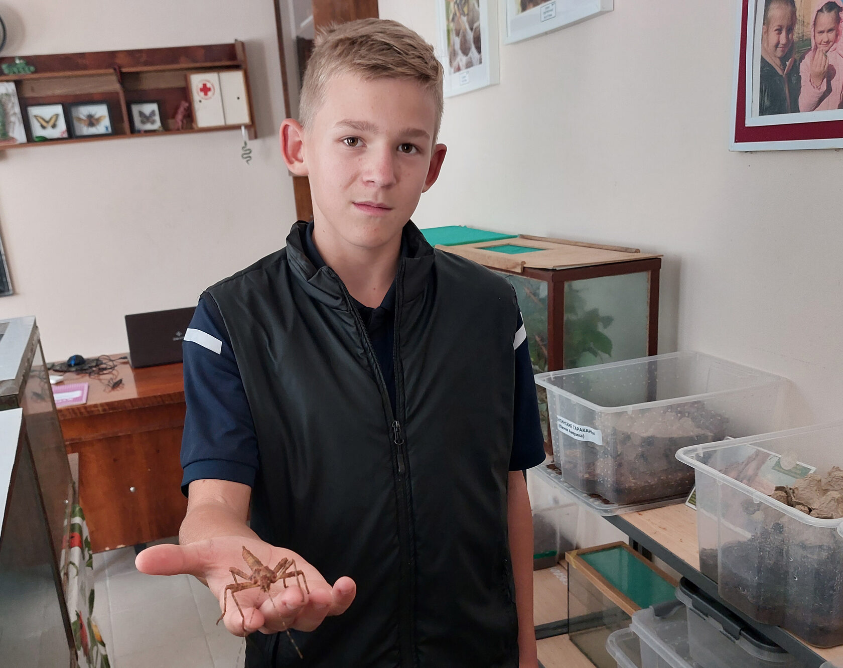 Благо на станции есть богатая коллекция экзотических палочников, жуков, тараканов и пауков. Таких, как тот палочник, которого рассматривает ученик СОШ №9 Артём Габидулин.