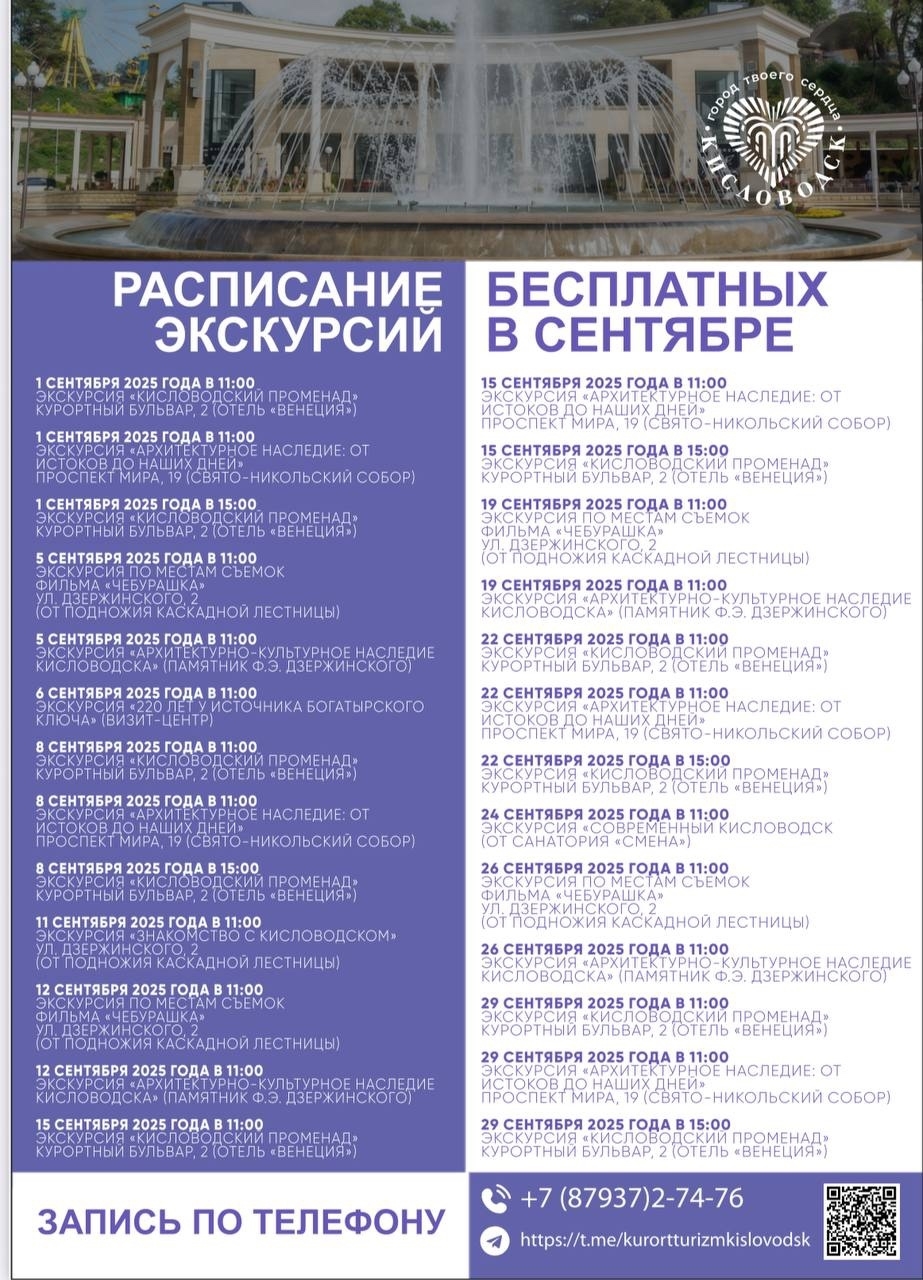 Администрация города-курорта совместно с местными туристическими фирмами организует в сентябре 26 бесплатных экскурсий для жителей и гостей города.